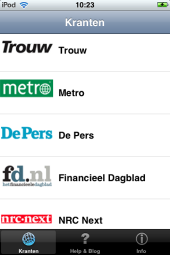 Kranten is een gratis applicatie waarmee je de websites van dagbladen leest op je iPhone of iPod touch. In de software zijn 62 grote kranten vanuit de hele wereld opgenomen.